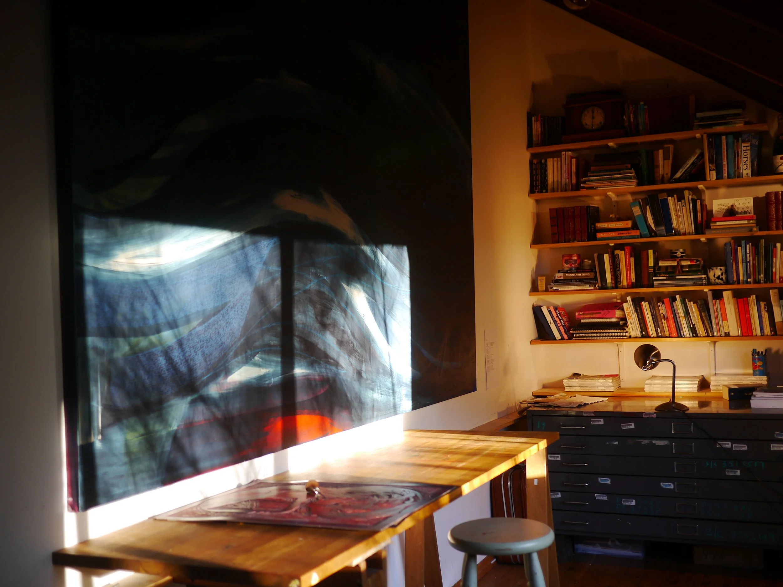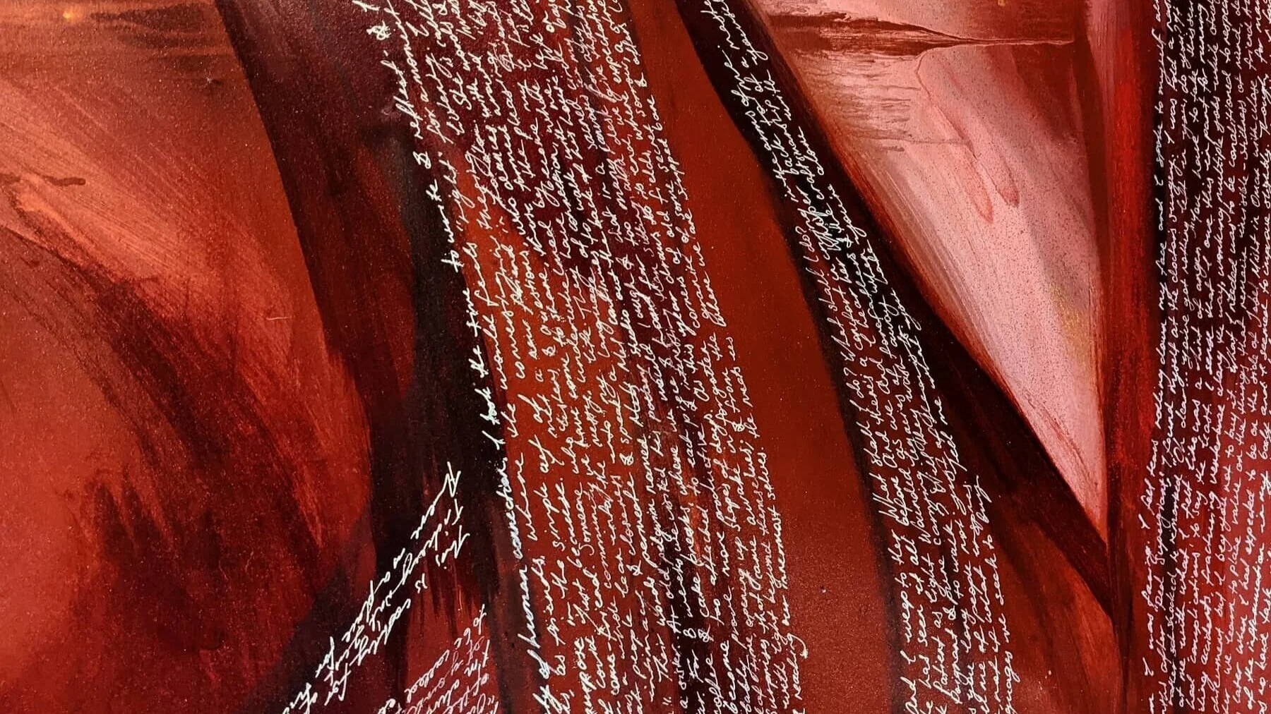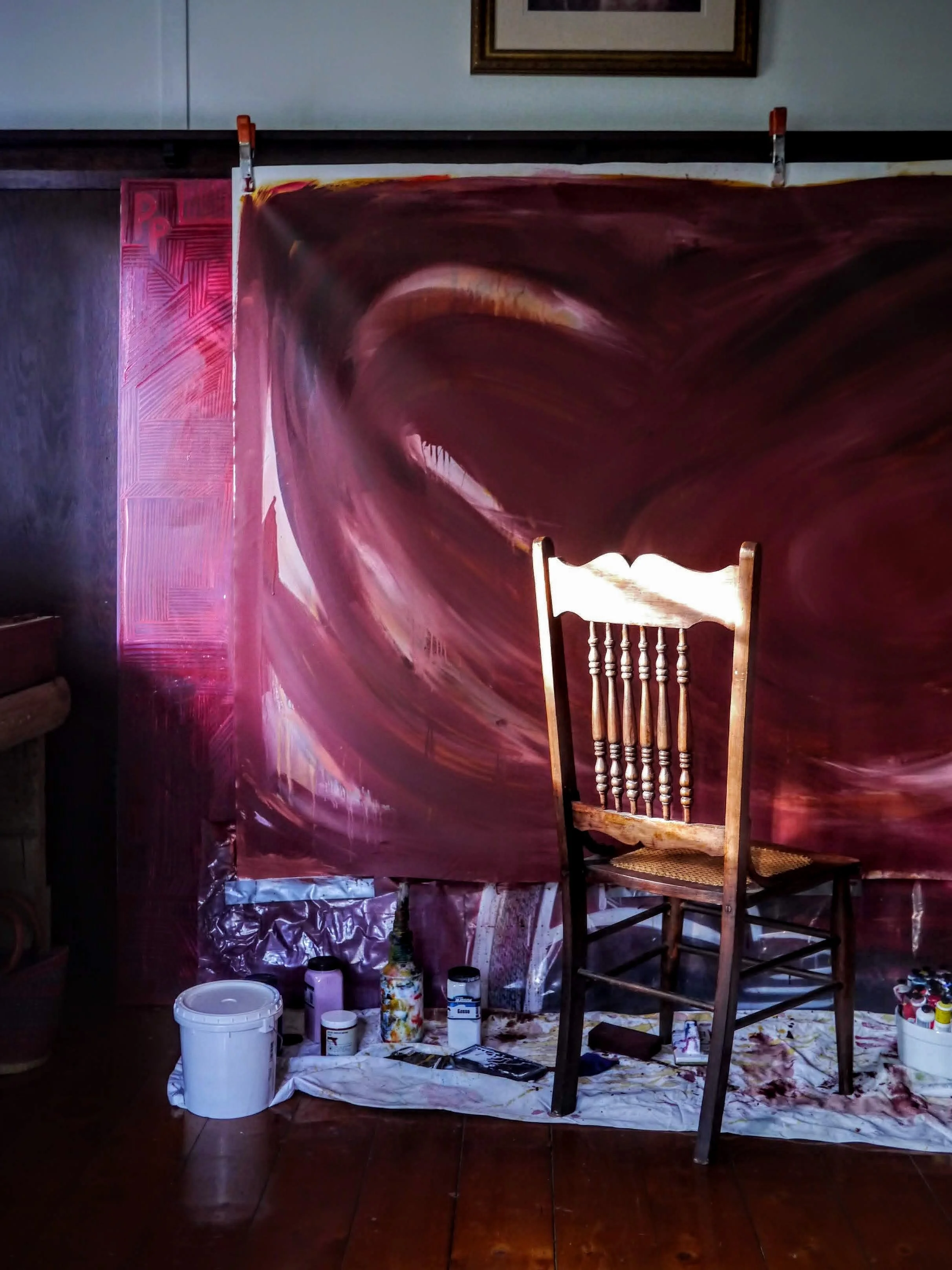 Her abstract paintings are characterised by large fluid movement, script work and earthy tones.
