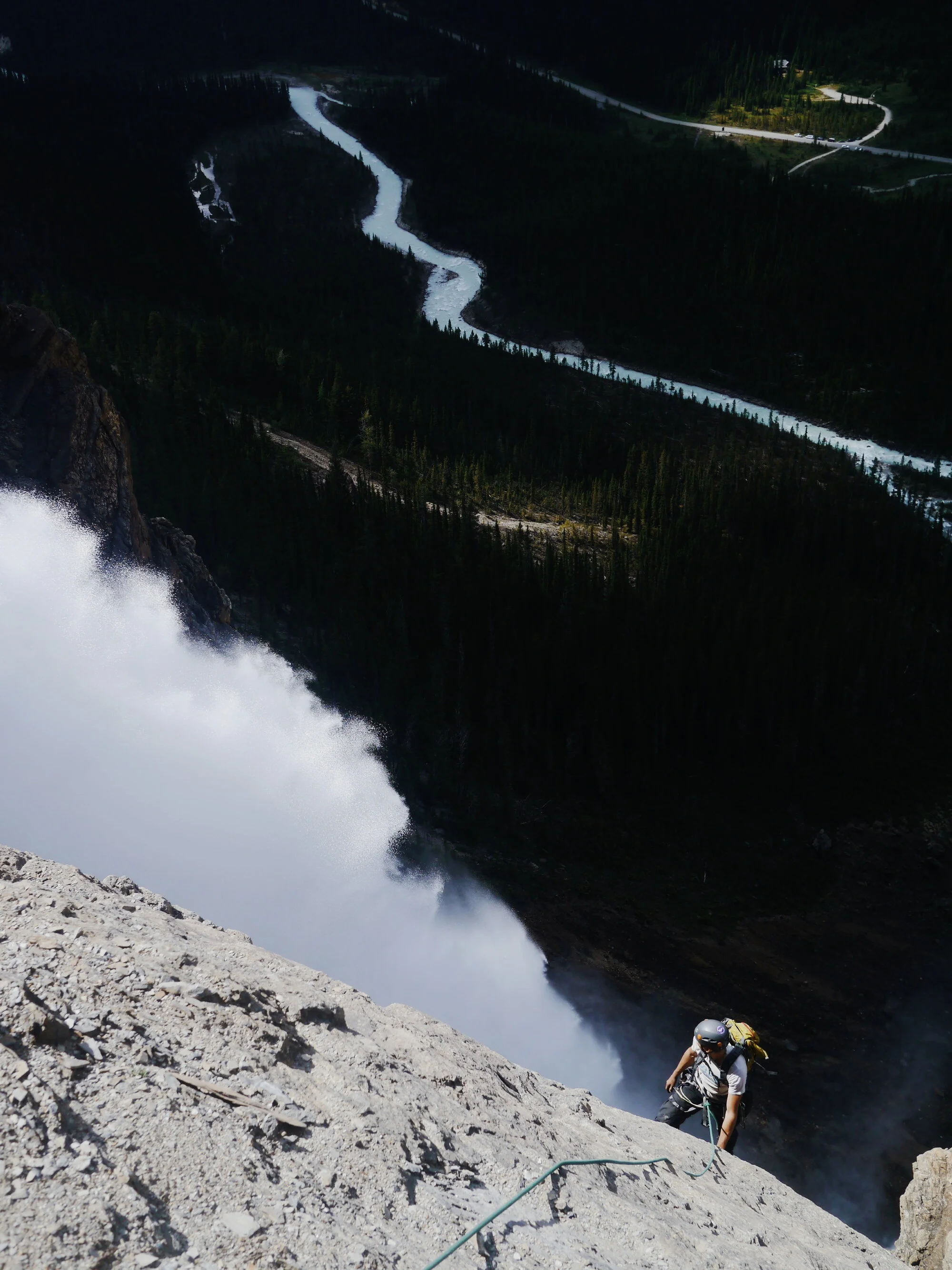 Jorge proposed a plan B, a climb called “Joy”. Clean, unadulterated fun - the kind of climb that doesn’t make you question why you’re doing what you’re doing. We drove out to Kananaskis as the sun rose and arrived at the car park, full of excitement. Although, perhaps a little too jittery with excitement as Jorge’s fingers triggered a bear spray test and we were soon on the floor weeping and coughing at the whiff of the pepper spray designed to subdue bears. We recovered and embarked on a meandering walk through the forest to the base of the climb. Emerging from the forest, we turned a corner to find ourselves at the foot of a 610m grey corner slab. It was a sight to behold, aesthetic beyond measure. Think of a brochure a travel agent would use to try to sell you the Rocky Mountains of Canada - snow capped peaks shooting up from the azure blue lake, pine forests lining the shores and a perfectly inviting gentle slab that seemed to take you right where you would want to be. It was my idea of a stairway to heaven. We enjoyed the brochure-standard view the whole day as we simul-climbed the slab and ran out 70m pitches. It was a day that awoke the senses - you feel the wind wash through your hair, the taste of rope between your teeth, fingers choose camelots and you share a sense of beauty with someone you’re tied to by rope.