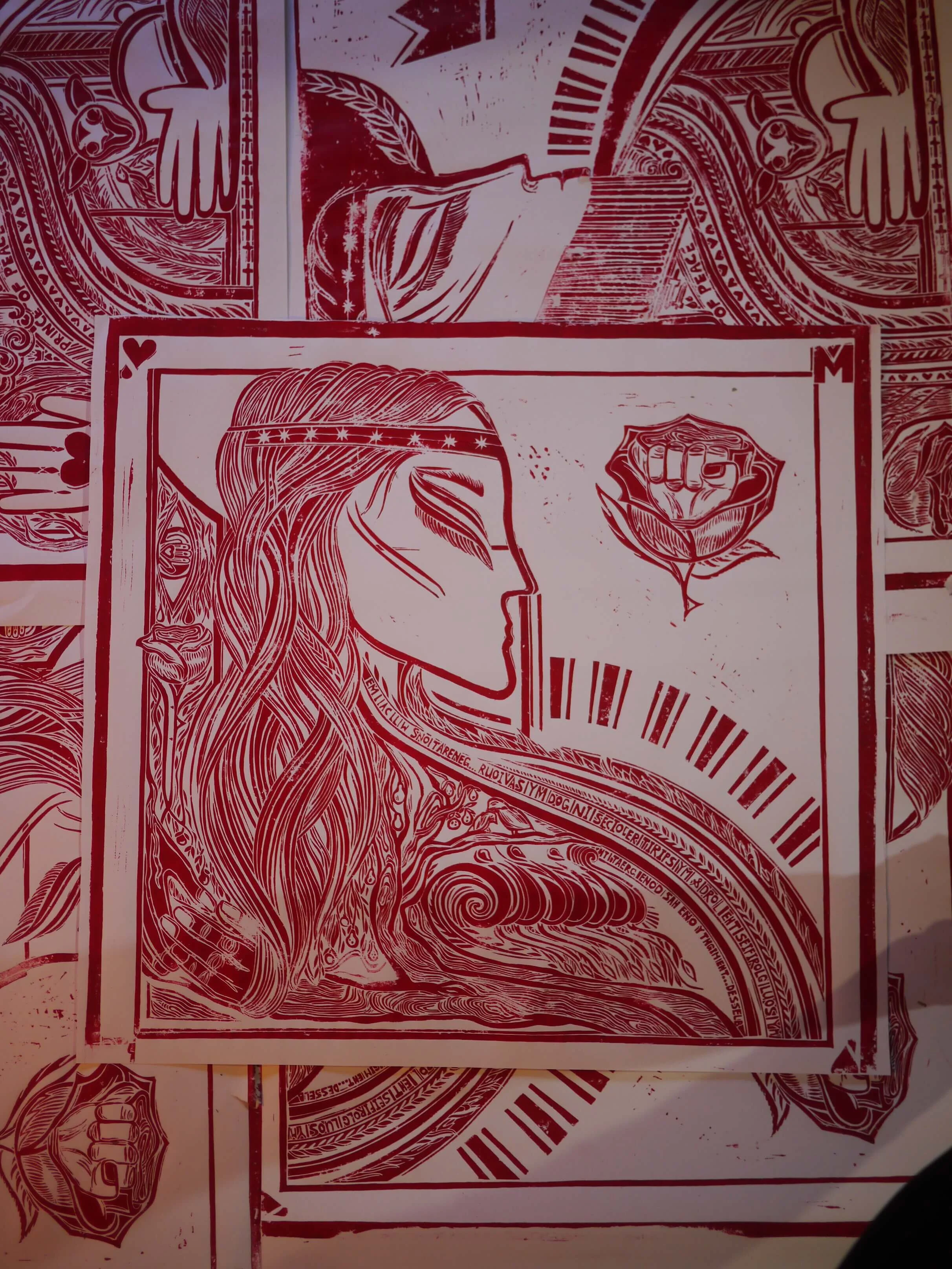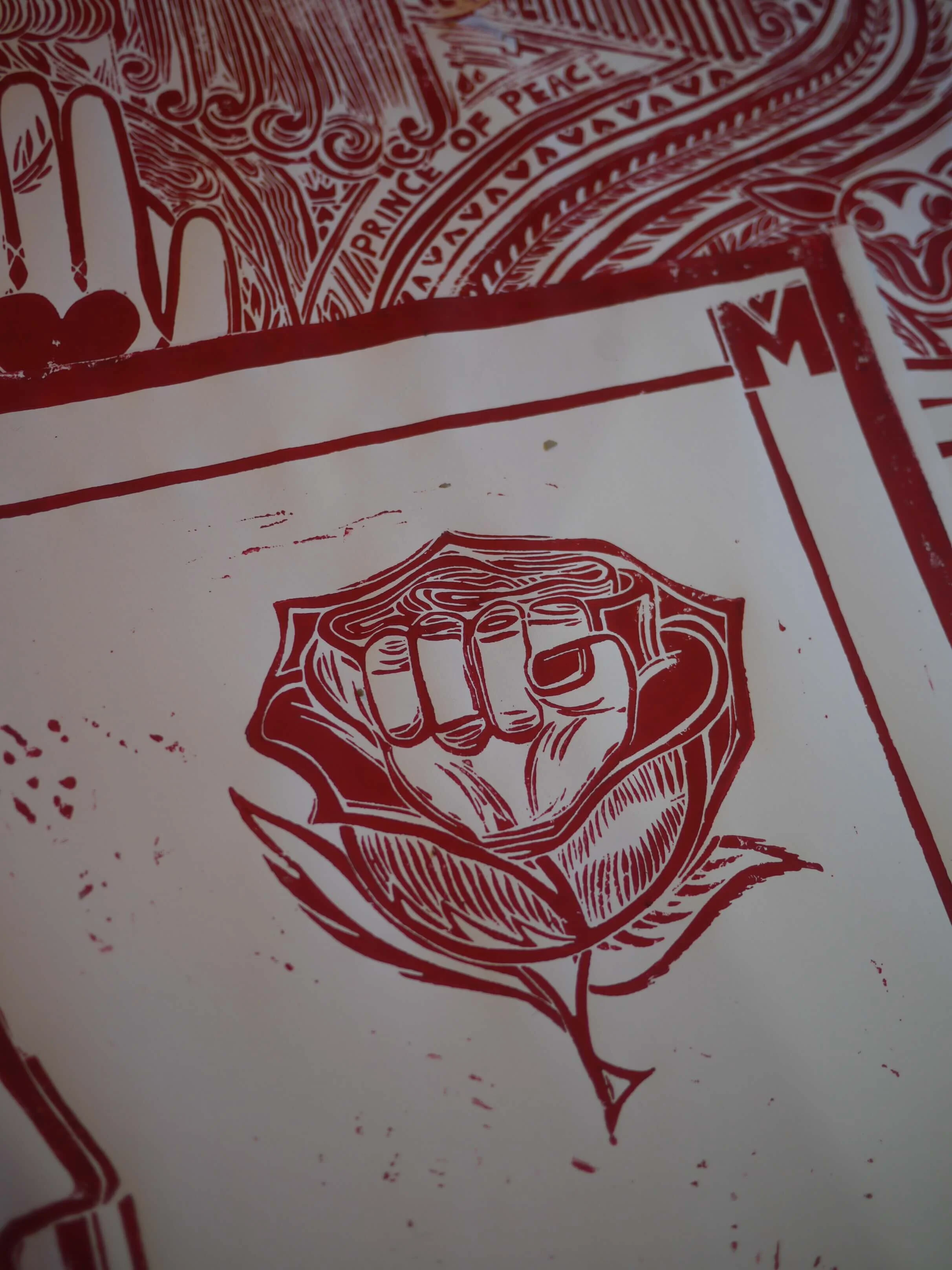It completely consumed me, and a 12 hour-day of carving dipping in and out of this world was not an unusual occurrence, with naps and tea between. I joined “linocut friends”, a community group on Facebook, where I would ask these welcoming strangers for advice on all the technical difficulties I was experiencing as a beginner. Soon I was excited to get out of bed, brew some coffee, sit down and get to work on the latest portrait without any pressure of performance. It was a new experience to be excited by something so sedentary and still. Pieces of lino would follow me everywhere, including work at the Ledge Climbing Centre where in the zombie hour before closing (9pm - 10pm), I would gently carve one of my projects. The Ledge community encouraged and followed me down this odd rabbit hole with many people sitting with me for a cup of tea, asking lots of questions as I continued on carving.